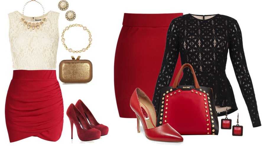 Данная вещь позволяет создавать одновременно провокационные и строгие образы. Если вы не можете сами разобраться, с чем лучше носить красную юбку, используйте такие базовые сочетания: