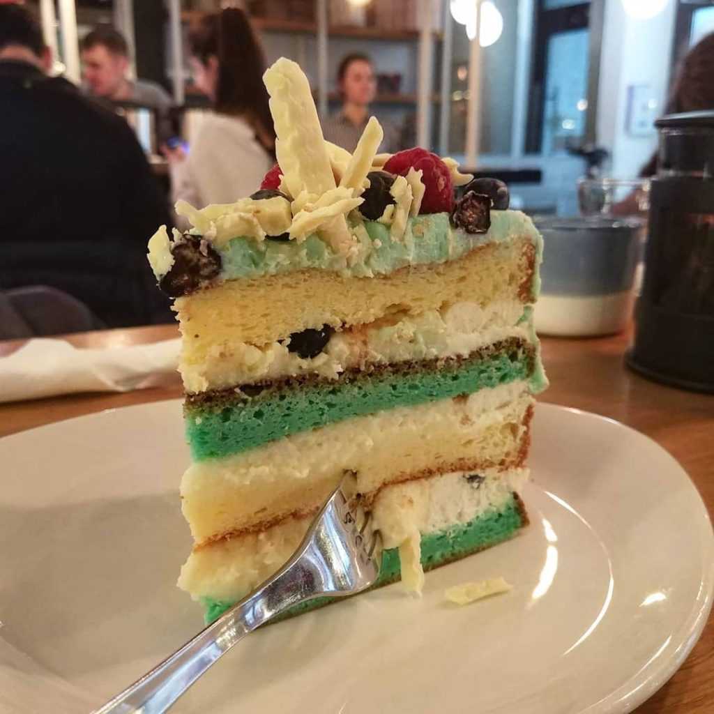 Японский чизкейк в роли бисквита, пудинг на белом шоколаде, свежие ягоды и ореховое печенье. Лёгкий по вкусу, почти не сладкий пудинг встречает приятно-вязкой текстурой и нежно растворяется во рту Упругая свежая черника игриво лопается, добавляет контраста в текстуре и крайне гармонично сочетается по вкусу. Воздушный и мягкий японский чизкейк отлично завершает картину. На фоне общей нежности и в текстурах, и во вкусах, белый крем на сливочном сыре, используемый в качестве дамбы, кажется слишком плотным и почти приторным, чем наталкивает на ассоциацию с постоявшей, подсохшей начникой. Радует, что крема этого в кусочке мало, а потому испортить конечное впечатление от торта ему не удаётся. Заявленное ореховое печенье себя не проявило и не ощутилось при всём желании найти хотя бы какие-то его отголоски. В целом – нежно, свежо и приятно, но кажется, что слишком хотели сделать интересно, а в итоге немного перемудрили.