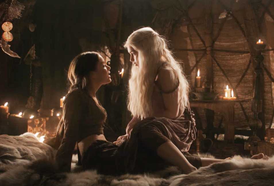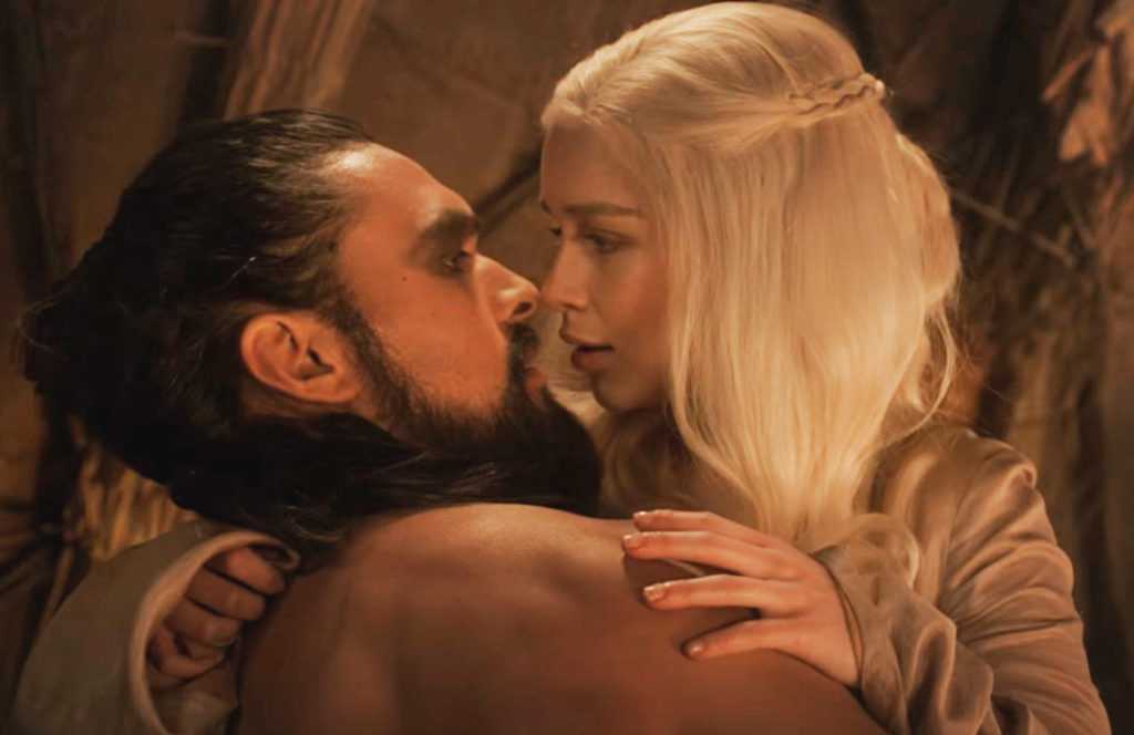 - 1 сезон, 2 серия: обучение ее служанкой и бывшей куртизанкой Дорой искусству любви, а также постельная сцена с ее новым мужем Кхалом Дрого (Джейсон Момоа).